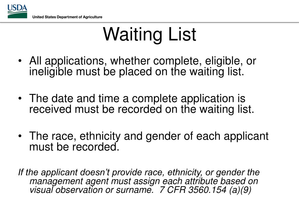 Waiting List • All applications, whether complete, eligible, or ineligible must be placed on the waiting list. • The date and time a complete application is received must be recorded on the waiting list. • The race, ethnicity and gender of each applicant must be recorded. If the applicant doesn’t provide race, ethnicity, or gender the management agent must assign each attribute based on visual observation or surname. 7 CFR 3560.154 (a)(9)