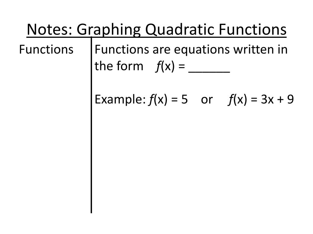 Notes: Graphing Quadratic Functions Functions are equations written in the form f(x) = ______ Example: f(x) = 5 or f(x) = 3x + 9 Functions