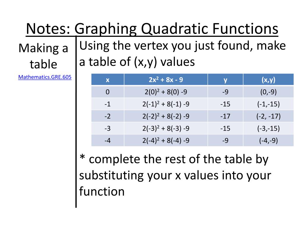 Notes: Graphing Quadratic Functions Using the vertex you just found, make a table of (x,y) values * complete the rest of the table by substituting your x values into your function Making a table Mathematics.GRE.605
