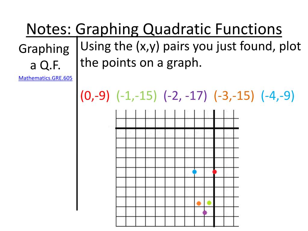 Notes: Graphing Quadratic Functions Using the (x,y) pairs you just found, plot the points on a graph. (0,-9) (-1,-15) (-2, -17) (-3,-15) (-4,-9) Graphing a Q.F. Mathematics.GRE.605