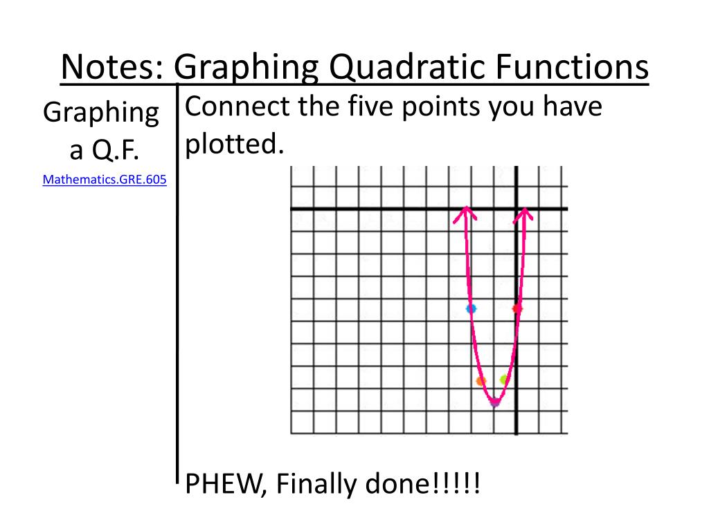 Notes: Graphing Quadratic Functions Connect the five points you have plotted. PHEW, Finally done!!!!! Graphing a Q.F. Mathematics.GRE.605