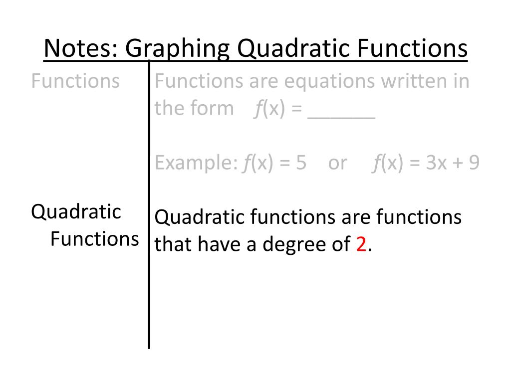 Notes: Graphing Quadratic Functions Functions are equations written in the form f(x) = ______ Example: f(x) = 5 or f(x) = 3x + 9 Quadratic functions are functions that have a degree of 2. Example: f(x) = 2x2 + 4x – 9 Functions Quadratic Functions