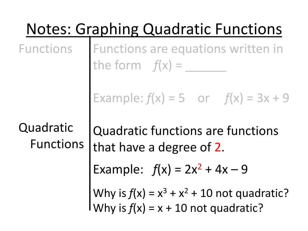 Notes: Graphing Quadratic Functions Functions are equations written in the form f(x) = ______ Example: f(x) = 5 or f(x) = 3x + 9 Quadratic functions are functions that have a degree of 2. Example: f(x) = 2x2 + 4x – 9 Why is f(x) = x3 + x2 + 10 not quadratic? Functions Quadratic Functions