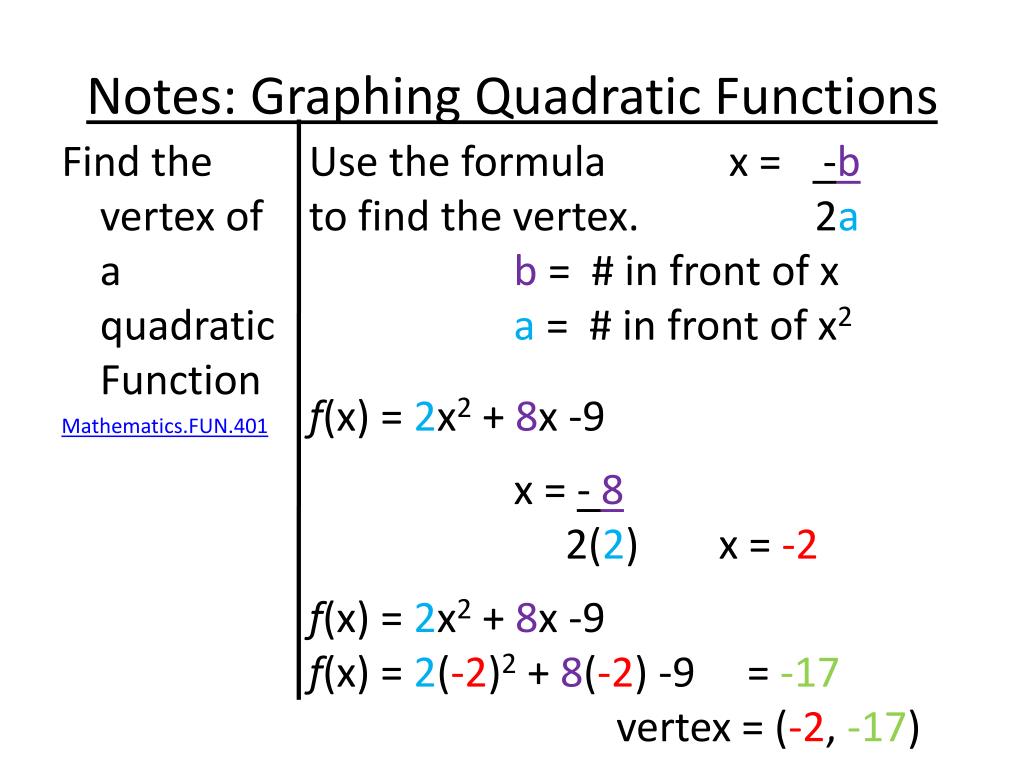 Notes: Graphing Quadratic Functions Use the formula x = -b to find the vertex. 2a b = # in front of x a = # in front of x2 f(x) = 2x2 + 8x -9 x = - 8 2(2) x = -2 f(x) = 2x2 + 8x -9 f(x) = 2(-2)2 + 8(-2) -9 = -17 vertex = (-2, -17) Find the vertex of a quadratic Function Mathematics.FUN.401