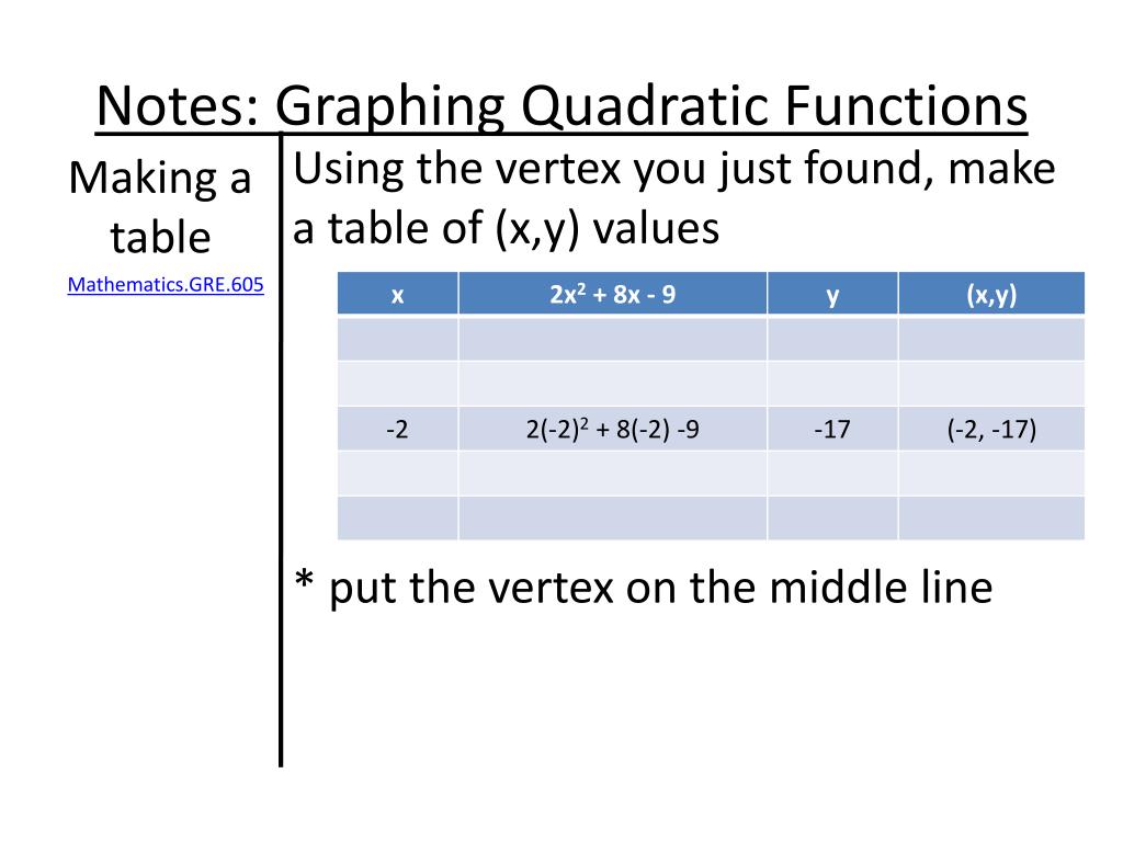 Notes: Graphing Quadratic Functions Using the vertex you just found, make a table of (x,y) values * put the vertex on the middle line Making a table Mathematics.GRE.605