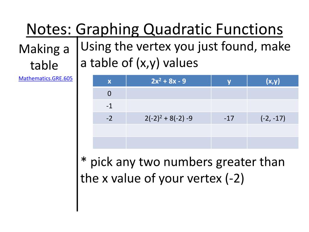 Notes: Graphing Quadratic Functions Using the vertex you just found, make a table of (x,y) values * pick any two numbers greater than the x value of your vertex (-2) Making a table Mathematics.GRE.605