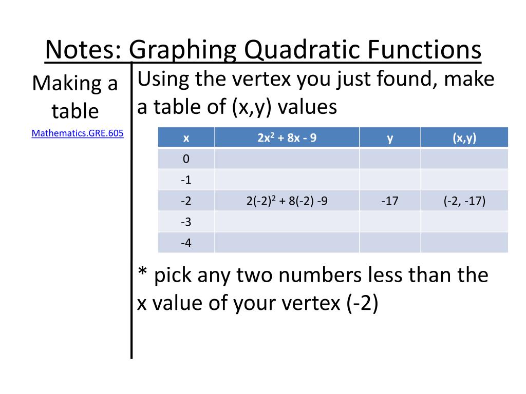 Notes: Graphing Quadratic Functions Using the vertex you just found, make a table of (x,y) values * pick any two numbers less than the x value of your vertex (-2) Making a table Mathematics.GRE.605