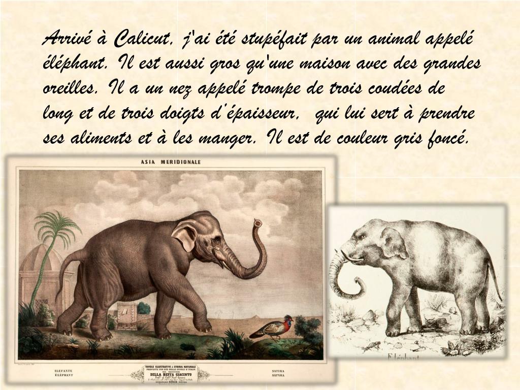 Arrivé à Calicut, j'ai été stupéfait par un animal appelé éléphant. Il est aussi gros qu'une maison avec des grandes oreilles. Il a un nez appelé trompe de trois coudées de long et de trois doigts d’épaisseur, qui lui sert à prendre ses aliments et à les manger. Il est de couleur gris foncé.
