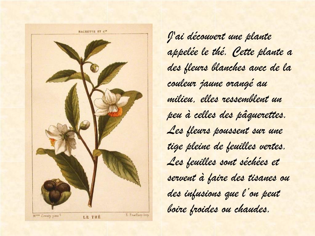 J'ai découvert une plante appelée le thé. Cette plante a des fleurs blanches avec de la couleur jaune orangé au milieu, elles ressemblent un peu à celles des pâquerettes. Les fleurs poussent sur une tige pleine de feuilles vertes. Les feuilles sont séchées et servent à faire des tisanes ou des infusions que l’on peut boire froides ou chaudes.