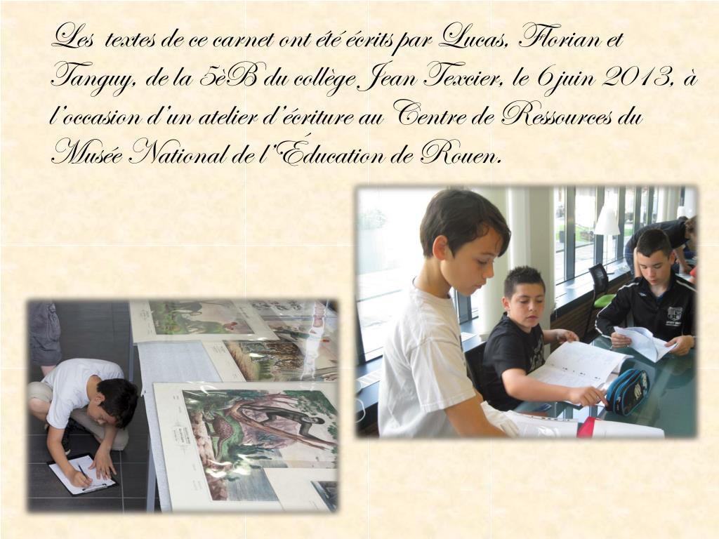 Les textes de ce carnet ont été écrits par Lucas, Florian et Tanguy, de la 5èB du collège Jean Texcier, le 6 juin 2013, à l’occasion d’un atelier d’écriture au Centre de Ressources du Musée National de l’Éducation de Rouen.