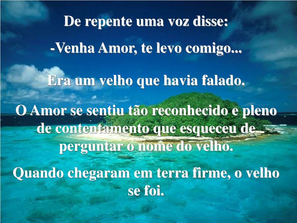 De repente uma voz disse: -Venha Amor, te levo comigo... Era um velho que havia falado. O Amor se sentiu tão reconhecido e pleno de contentamento que esqueceu de perguntar o nome do velho. Quando chegaram em terra firme, o velho se foi.