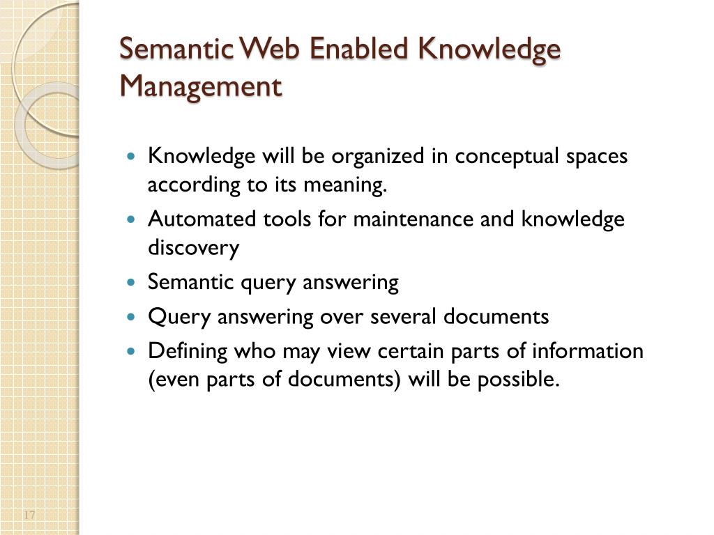 Semantic Web Enabled Knowledge Management • Knowledge will be organized in conceptual spaces according to its meaning. • Automated tools for maintenance and knowledge discovery • Semantic query answering • Query answering over several documents • Defining who may view certain parts of information (even parts of documents) will be possible.