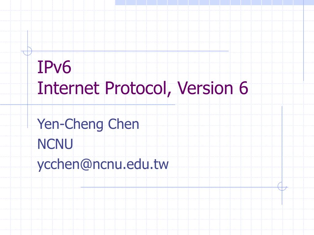 IPv6Internet Protocol, Version 6 Yen-Cheng Chen NCNU ycchen@ncnu.edu.tw