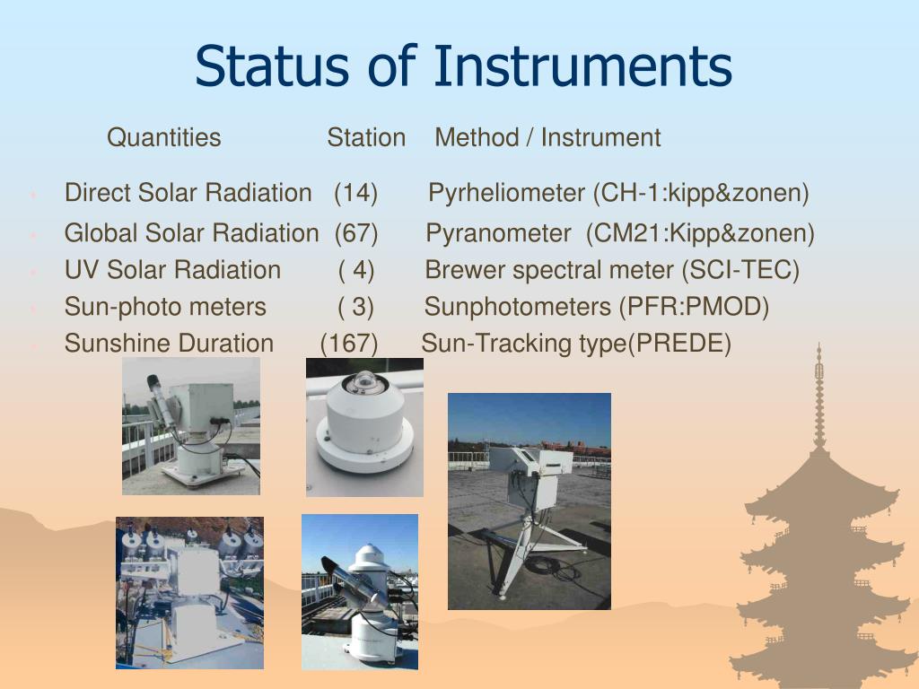 Status of Instruments Quantities Station Method / Instrument • Direct Solar Radiation (14) Pyrheliometer (CH-1:kipp&zonen) • Global Solar Radiation (67) Pyranometer (CM21:Kipp&zonen) • UV Solar Radiation ( 4) Brewer spectral meter (SCI-TEC) • Sun-photo meters ( 3) Sunphotometers (PFR:PMOD) • Sunshine Duration (167) Sun-Tracking type(PREDE)