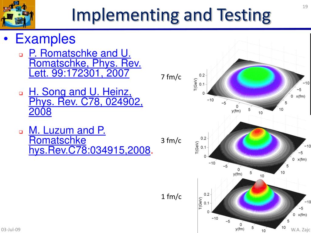 Implementing and Testing • Examples • P. Romatschke and U. Romatschke, Phys. Rev. Lett. 99:172301, 2007 • H. Song and U. Heinz, Phys. Rev. C78, 024902, 2008 • M. Luzum and P. Romatschke hys.Rev.C78:034915,2008. 7 fm/c 3 fm/c 1 fm/c W.A. Zajc