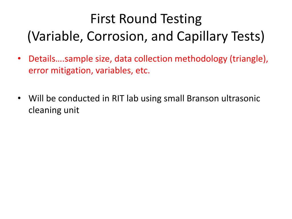 First Round Testing (Variable, Corrosion, and Capillary Tests) • Details….sample size, data collection methodology (triangle), error mitigation, variables, etc. • Will be conducted in RIT lab using small Branson ultrasonic cleaning unit