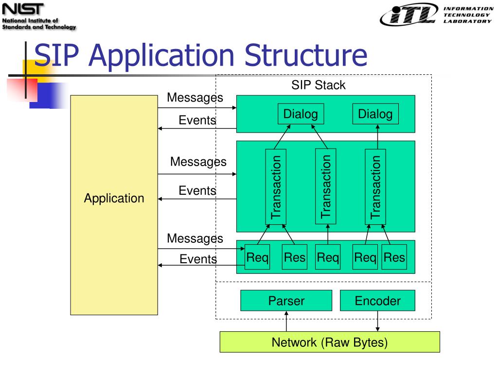 SIP Application Structure SIP Stack Messages Application Dialog Dialog Events Messages Transaction Transaction Transaction Events Messages Req Res Req Req Res Events Parser Encoder Network (Raw Bytes)