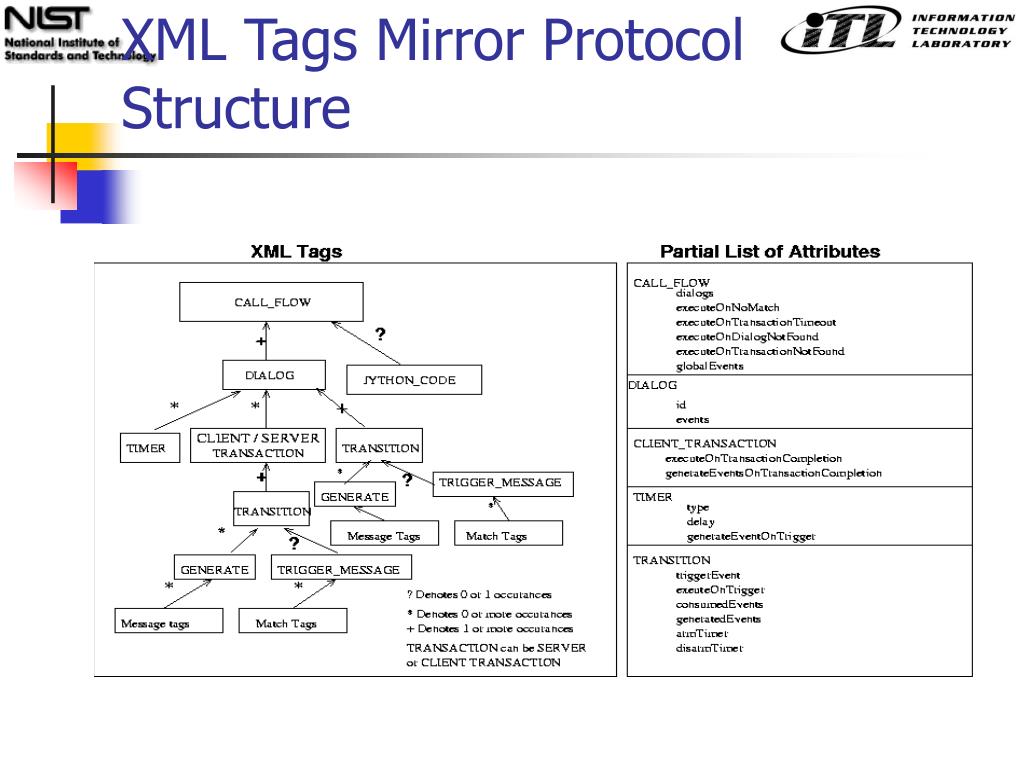Motivation • Compact representation that matches the RFC • XML is hierarchical - good way to represent SIP protocol abstractions • Interoperability testing with control • Typically components are tested in call flow scenarios • Typically operating in an un-controlled environment • Reproducing complex scenarios is difficult