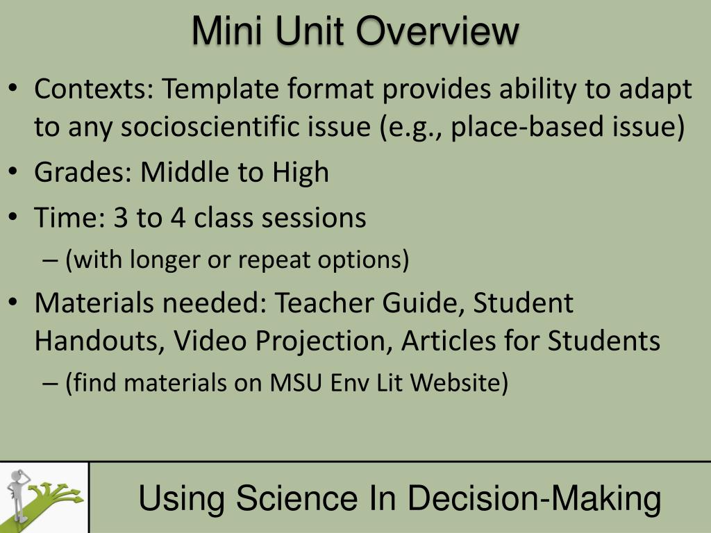 Mini Unit Overview Using Science In Decision-Making • Contexts: Template format provides ability to adapt to any socioscientific issue (e.g., place-based issue) • Grades: Middle to High • Time: 3 to 4 class sessions • (with longer or repeat options) • Materials needed: Teacher Guide, Student Handouts, Video Projection, Articles for Students • (find materials on MSU Env Lit Website)