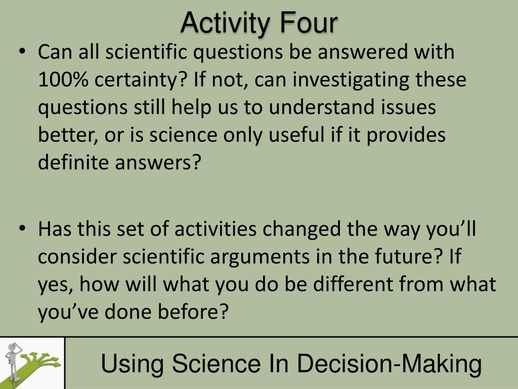 Activity Four Using Science In Decision-Making • Can all scientific questions be answered with 100% certainty? If not, can investigating these questions still help us to understand issues better, or is science only useful if it provides definite answers? • Has this set of activities changed the way you’ll consider scientific arguments in the future? If yes, how will what you do be different from what you’ve done before?