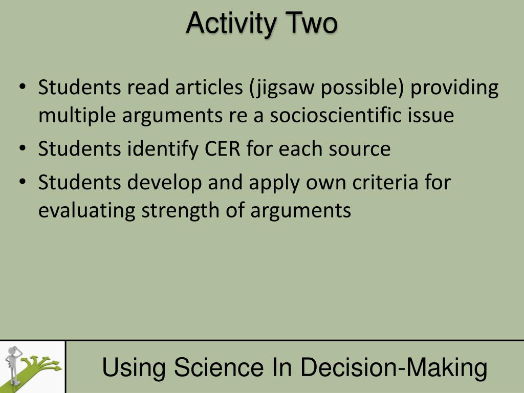 Activity Two Using Science In Decision-Making • Students read articles (jigsaw possible) providing multiple arguments re a socioscientific issue • Students identify CER for each source • Students develop and apply own criteria for evaluating strength of arguments