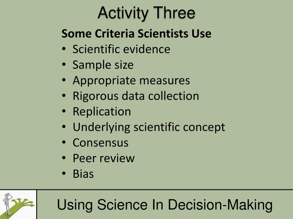 Activity Three Using Science In Decision-Making Some Criteria Scientists Use • Scientific evidence • Sample size • Appropriate measures • Rigorous data collection • Replication • Underlying scientific concept • Consensus • Peer review • Bias