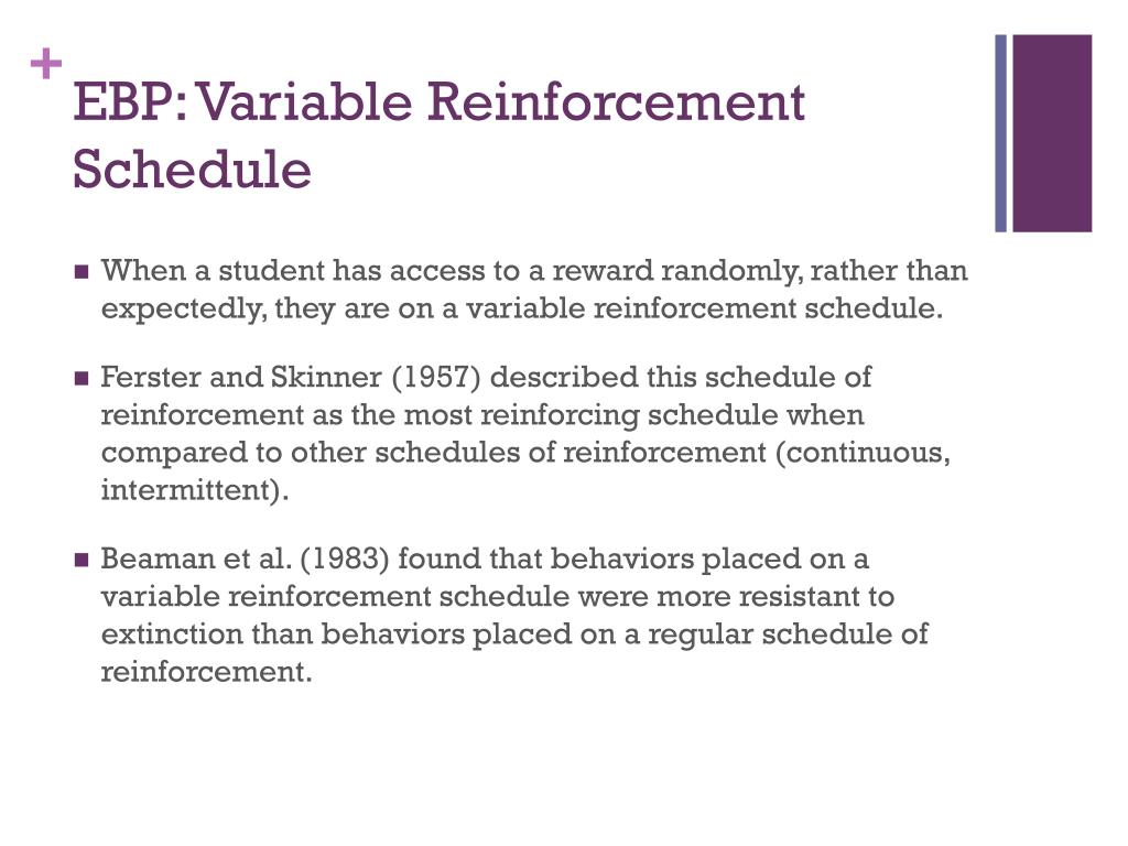 EBP: Variable Reinforcement Schedule • When a student has access to a reward randomly, rather than expectedly, they are on a variable reinforcement schedule. • Ferster and Skinner (1957) described this schedule of reinforcement as the most reinforcing schedule when compared to other schedules of reinforcement (continuous, intermittent). • Beaman et al. (1983) found that behaviors placed on a variable reinforcement schedule were more resistant to extinction than behaviors placed on a regular schedule of reinforcement.
