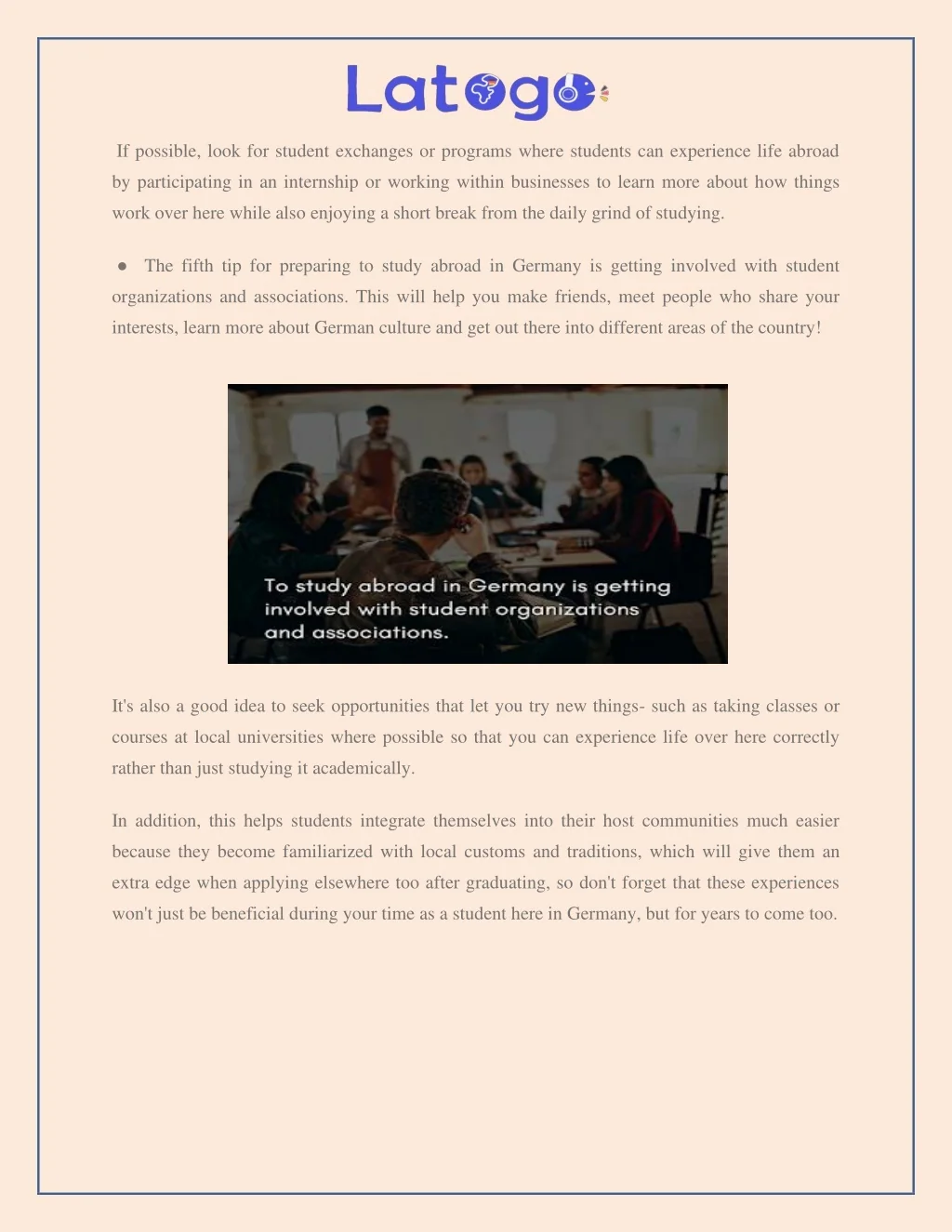 If possible, look for student exchanges or programs where students can experience life abroad by participating in an internship or working within businesses to learn more about how things work over here while also enjoying a short break from the daily grind of studying. ●The fifth tip for preparing to study abroad in Germany is getting involved with student organizations and associations. This will help you make friends, meet people who share your interests, learn more about German culture and get out there into different areas of the country! It's also a good idea to seek opportunities that let you try new things- such as taking classes or courses at local universities where possible so that you can experience life over here correctly rather than just studying it academically. In addition, this helps students integrate themselves into their host communities much easier because they become familiarized with local customs and traditions, which will give them an extra edge when applying elsewhere too after graduating, so don't forget that these experiences won't just be beneficial during your time as a student here in Germany, but for years to come too.