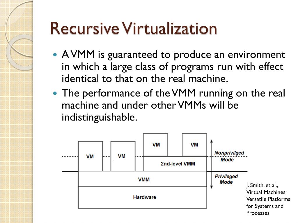 Recursive Virtualization • A VMM is guaranteed to produce an environment in which a large class of programs run with effect identical to that on the real machine. • The performance of the VMM running on the real machine and under other VMMs will be indistinguishable. J. Smith, et al., Virtual Machines: Versatile Platforms for Systems and Processes