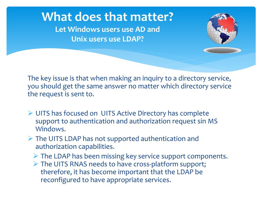 What does that matter? Let Windows users use AD and Unix users use LDAP? The key issue is that when making an inquiry to a directory service, you should get the same answer no matter which directory service the request is sent to. • UITS has focused on UITS Active Directory has complete support to authentication and authorization request sin MS Windows. • The UITS LDAP has not supported authentication and authorization capabilities. • The LDAP has been missing key service support components. • The UITS RNAS needs to have cross-platform support; therefore, it has become important that the LDAP be reconfigured to have appropriate services.