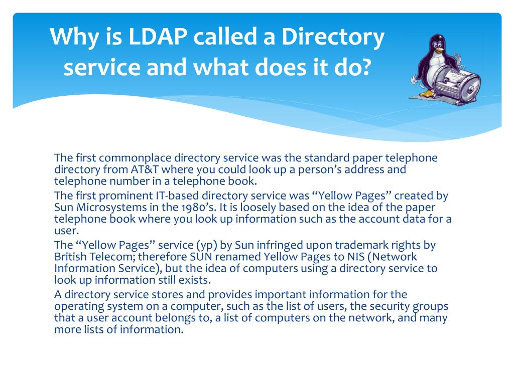 Why is LDAP called a Directory service and what does it do? The first commonplace directory service was the standard paper telephone directory from AT&T where you could look up a person’s address and telephone number in a telephone book. The first prominent IT-based directory service was “Yellow Pages” created by Sun Microsystems in the 1980’s. It is loosely based on the idea of the paper telephone book where you look up information such as the account data for a user. The “Yellow Pages” service (yp) by Sun infringed upon trademark rights by British Telecom; therefore SUN renamed Yellow Pages to NIS (Network Information Service), but the idea of computers using a directory service to look up information still exists. A directory service stores and provides important information for the operating system on a computer, such as the list of users, the security groups that a user account belongs to, a list of computers on the network, and many more lists of information.