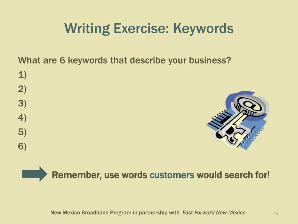 Writing Exercise: Keywords What are 6 keywords that describe your business? 1) 2) 3) 4) 5) 6) Remember, use words customerswould search for!