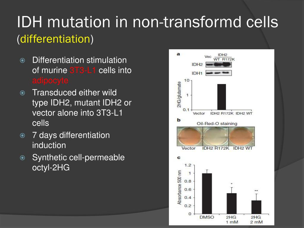 IDH mutation in non-transformd cells (differentiation) • Differentiation stimulation of murine 3T3-L1 cells into adipocyte • Transduced either wild type IDH2, mutant IDH2 or vector alone into 3T3-L1 cells • 7 days differentiation induction • Synthetic cell-permeable octyl-2HG