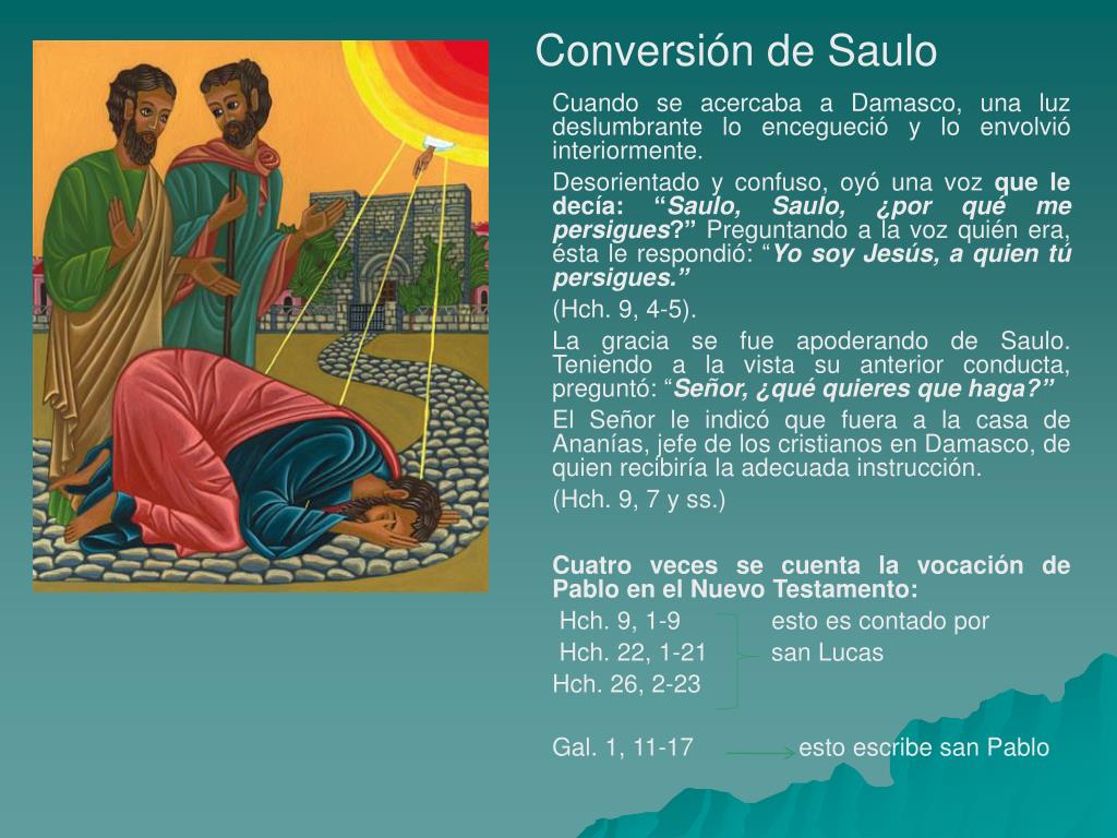 Conversión de Saulo Cuando se acercaba a Damasco, una luz deslumbrante lo encegueció y lo envolvió interiormente. Desorientado y confuso, oyó una voz que le decía: “Saulo, Saulo, ¿por qué me persigues?” Preguntando a la voz quién era, ésta le respondió: “Yo soy Jesús, a quien tú persigues.” (Hch. 9, 4-5). La gracia se fue apoderando de Saulo. Teniendo a la vista su anterior conducta, preguntó: “Señor, ¿qué quieres que haga?” El Señor le indicó que fuera a la casa de Ananías, jefe de los cristianos en Damasco, de quien recibiría la adecuada instrucción. (Hch. 9, 7 y ss.) Cuatro veces se cuenta la vocación de Pablo en el Nuevo Testamento: Hch. 9, 1-9 esto es contado por Hch. 22, 1-21 san Lucas Hch. 26, 2-23 Gal. 1, 11-17 esto escribe san Pablo