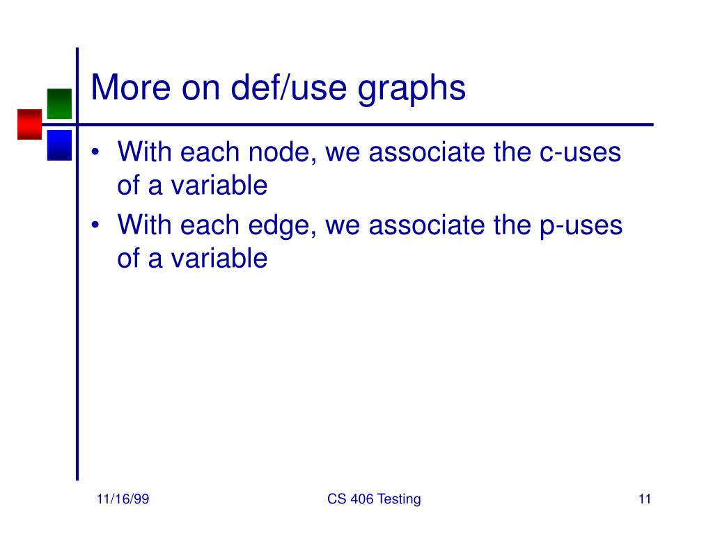 More on def/use graphs • With each node, we associate the c-uses of a variable • With each edge, we associate the p-uses of a variable CS 406 Testing