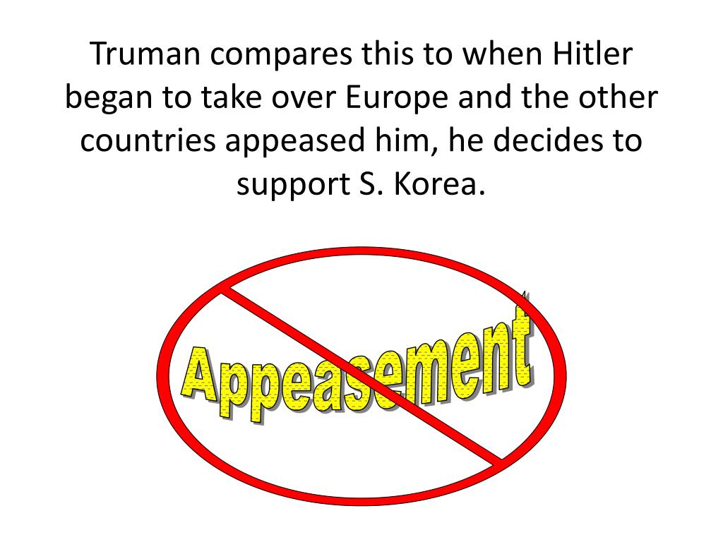 Truman compares this to when Hitler began to take over Europe and the other countries appeased him, he decides to support S. Korea. Appeasement