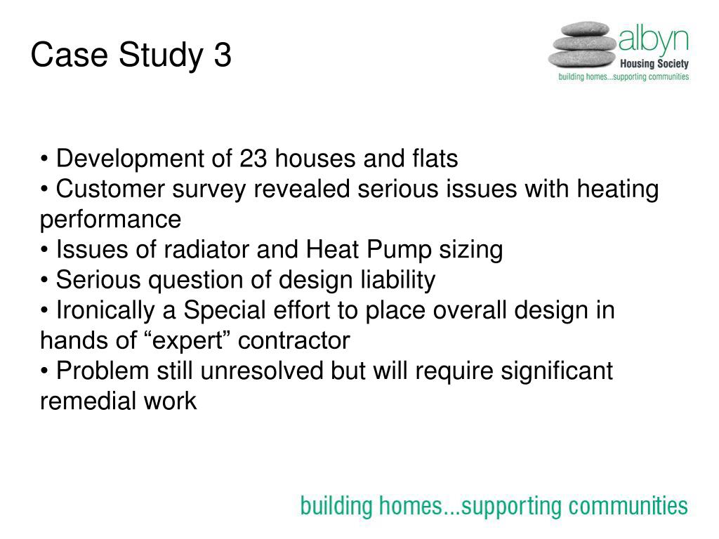 Case Study 3 • Development of 23 houses and flats • Customer survey revealed serious issues with heating performance • Issues of radiator and Heat Pump sizing • Serious question of design liability • Ironically a Special effort to place overall design in hands of “expert” contractor • Problem still unresolved but will require significant remedial work
