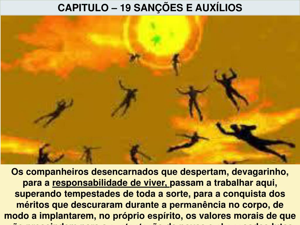 CAPITULO – 19 SANÇÕES E AUXÍLIOS Os companheirosdesencarnadosquedespertam, devagarinho, para a responsabilidade de viver, passam a trabalharaqui, superandotempestades de toda a sorte, para a conquista dos méritosquedescuraramdurante a permanência no corpo, de modo a implantarem, no próprioespírito, osvaloresmorais de quenãoprescindempara a sustentação de novas e abençoadaslutas no plano material.