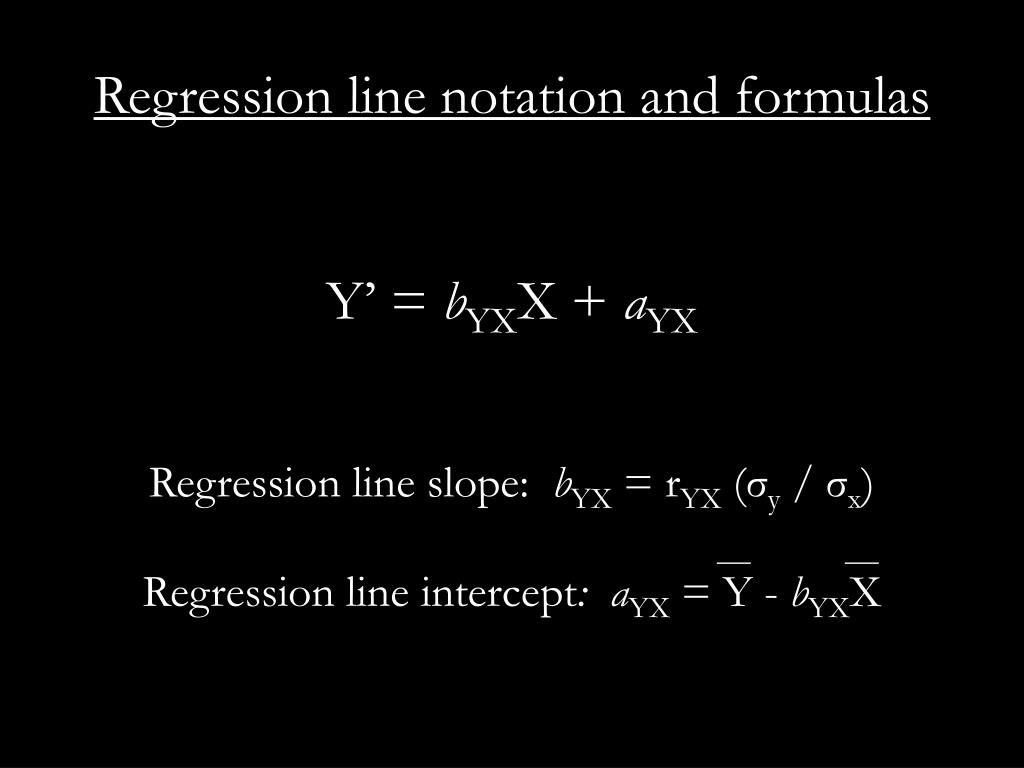 Regression line notation and formulas Y’ = bYXX + aYX Regression line slope: bYX = rYX (σy / σx) Regression line intercept: aYX = Y - bYXX