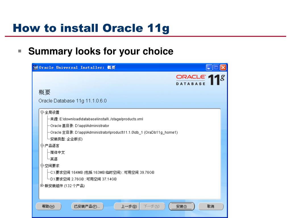 How to install Oracle 11g • Summary looks for your choice
