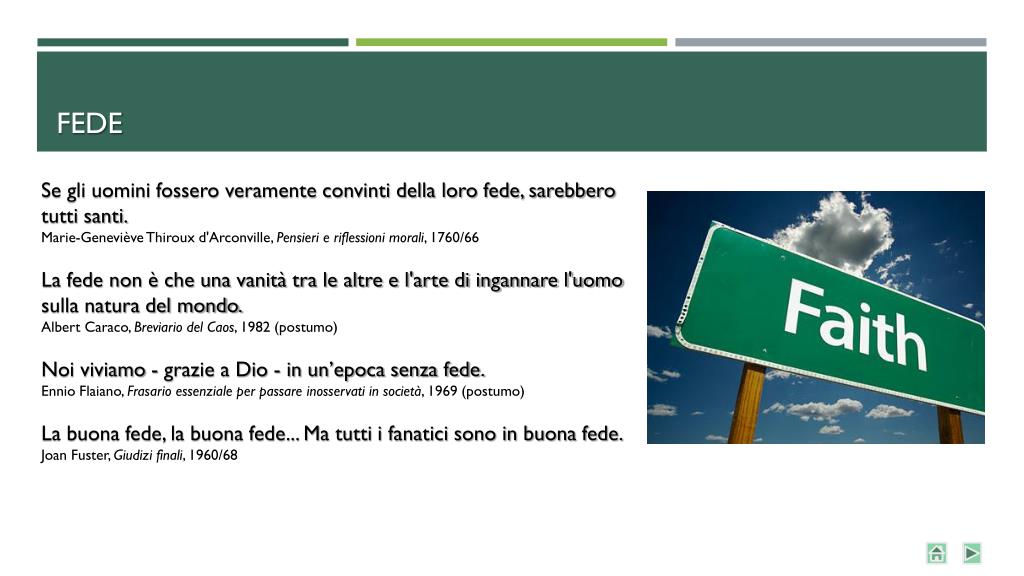 FEDE Se gli uomini fossero veramente convinti della loro fede, sarebbero tutti santi. Marie-GenevièveThiroux d'Arconville, Pensieri e riflessioni morali, 1760/66 La fede non è che una vanità tra le altre e l'arte di ingannare l'uomo sulla natura del mondo. Albert Caraco, Breviario del Caos, 1982 (postumo) Noi viviamo - grazie a Dio - in un’epoca senza fede. Ennio Flaiano, Frasario essenziale per passare inosservati in società, 1969 (postumo) La buona fede, la buona fede... Ma tutti i fanatici sono in buona fede. Joan Fuster, Giudizi finali, 1960/68
