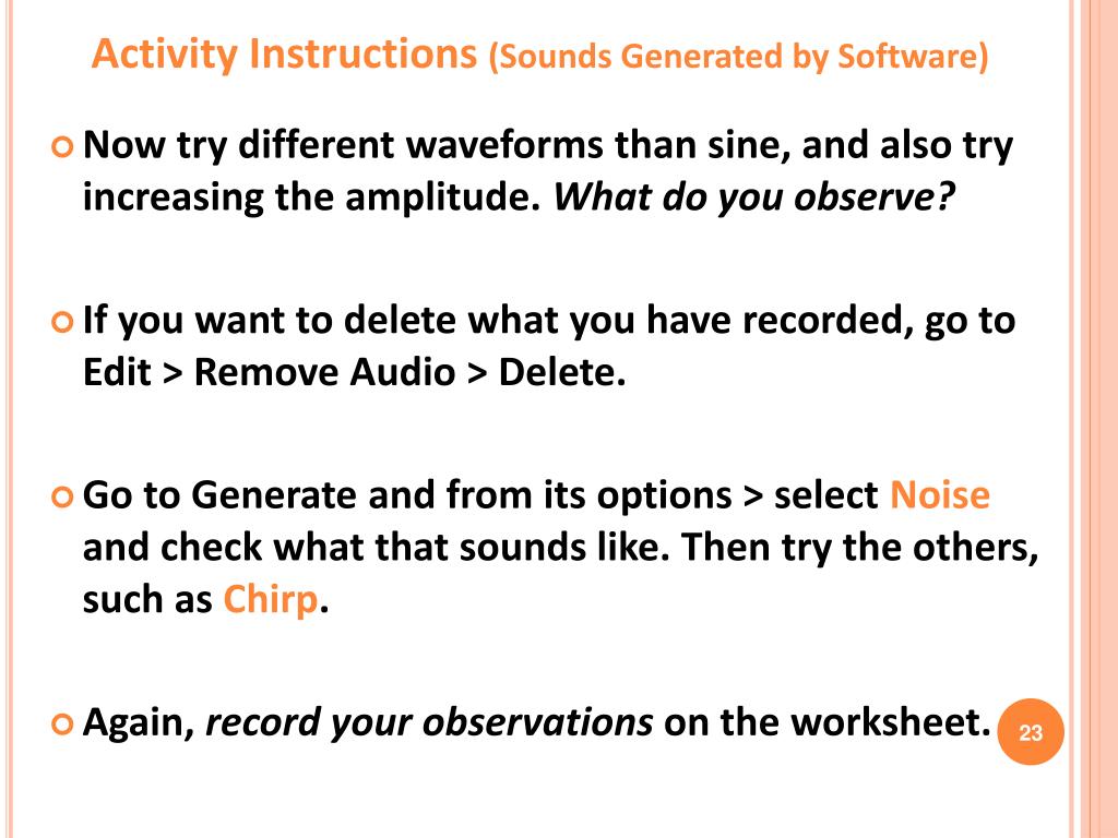 Activity Instructions (Sounds Generated by Software) • Now try different waveforms than sine, and also try increasing the amplitude. What do you observe? • If you want to delete what you have recorded, go to Edit > Remove Audio > Delete. • Go to Generate and from its options > select Noise and check what that sounds like. Then try the others, such as Chirp. • Again, record your observations on the worksheet.