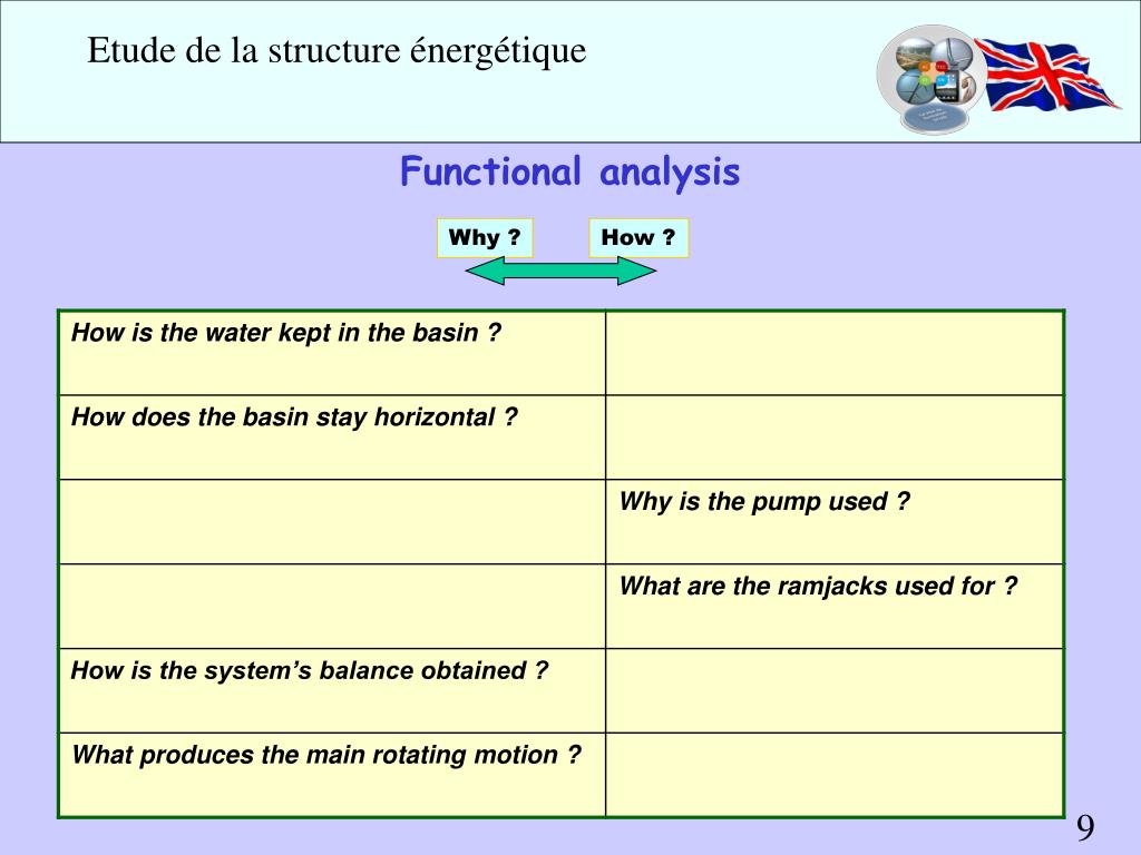 Etude de la structure énergétique Carry ships Contain water Basin Seal / gasket Stay level Cogs and gears Bring ships up or down Allow ship access Open gates Ram jack functional analysis Close gates Ram jack Equalize levels Pump Lift mass Produce rotation Hydraulic jack Counterbalance Natural counterweight Why ? How ? 8