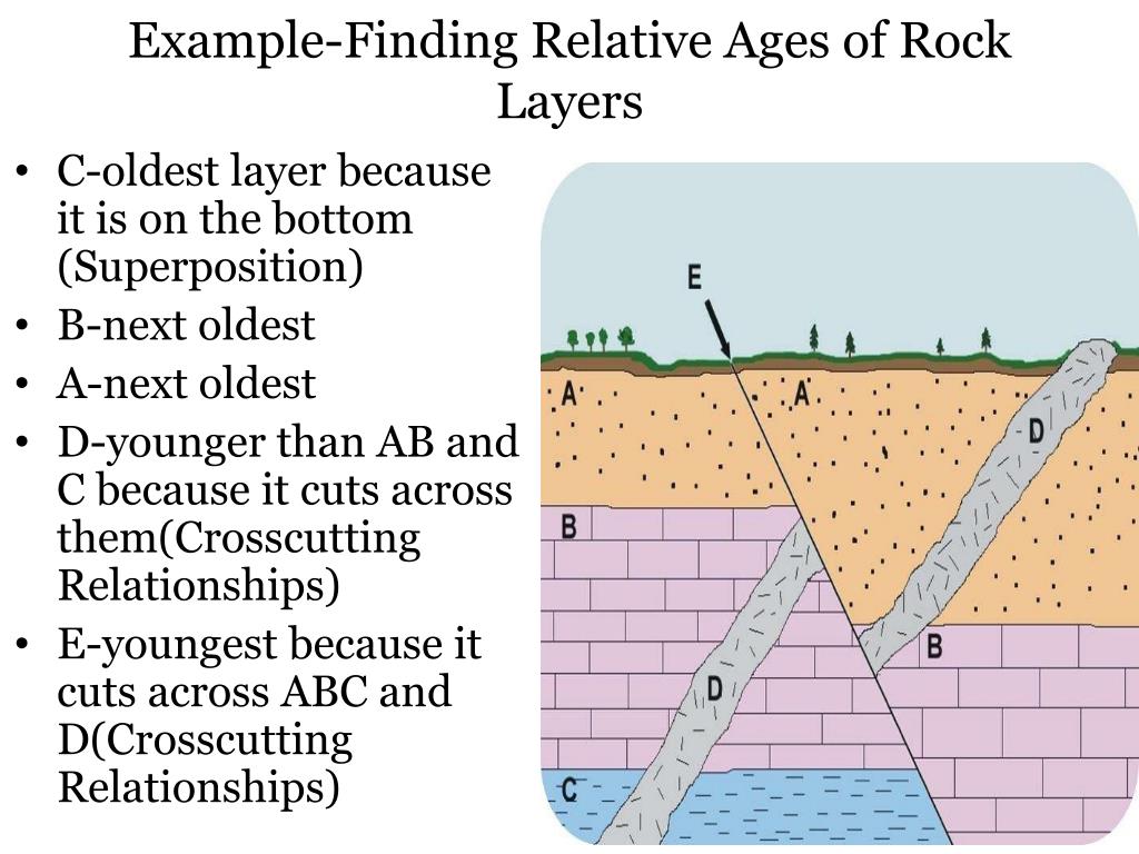 Example-Finding Relative Ages of Rock Layers • C-oldest layer because it is on the bottom (Superposition) • B-next oldest • A-next oldest • D-younger than AB and C because it cuts across them(Crosscutting Relationships) • E-youngest because it cuts across ABC and D(Crosscutting Relationships)