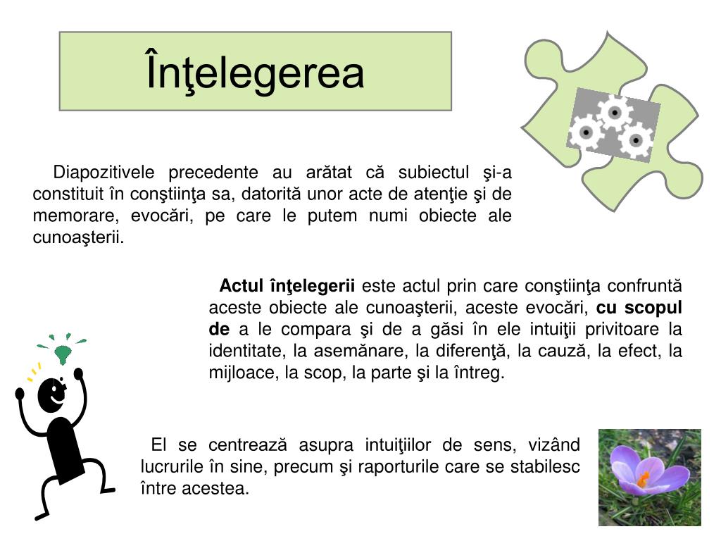 Înţelegerea Diapozitivele precedenteau arătat că subiectul şi-a constituit în conştiinţa sa, datorită unor acte de atenţie şi de memorare, evocări, pe care le putem numi obiecte ale cunoaşterii. Actul înţelegeriieste actul prin care conştiinţa confruntă aceste obiecte ale cunoaşterii, aceste evocări, cu scopul de a le compara şi de a găsi în eleintuiţii privitoare la identitate, la asemănare, la diferenţă, la cauză, la efect, la mijloace, la scop, la parte şi la întreg. El se centrează asupra intuiţiilor de sens, vizândlucrurile în sine, precum şi raporturile care se stabilesc între acestea.