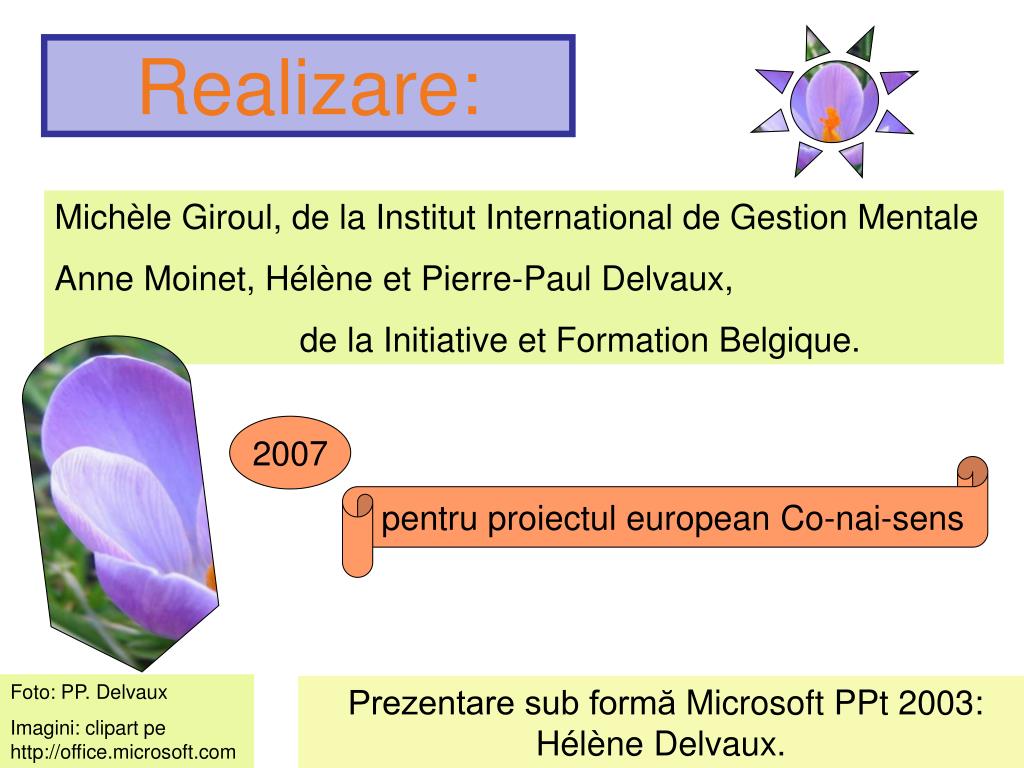 Realizare: Michèle Giroul, de la Institut International de Gestion Mentale Anne Moinet, Hélène et Pierre-Paul Delvaux, de la Initiative et Formation Belgique. 2007 pentru proiectul european Co-nai-sens Foto: PP. Delvaux Imagini: clipart pe http://office.microsoft.com Prezentare sub formă Microsoft PPt 2003: Hélène Delvaux.