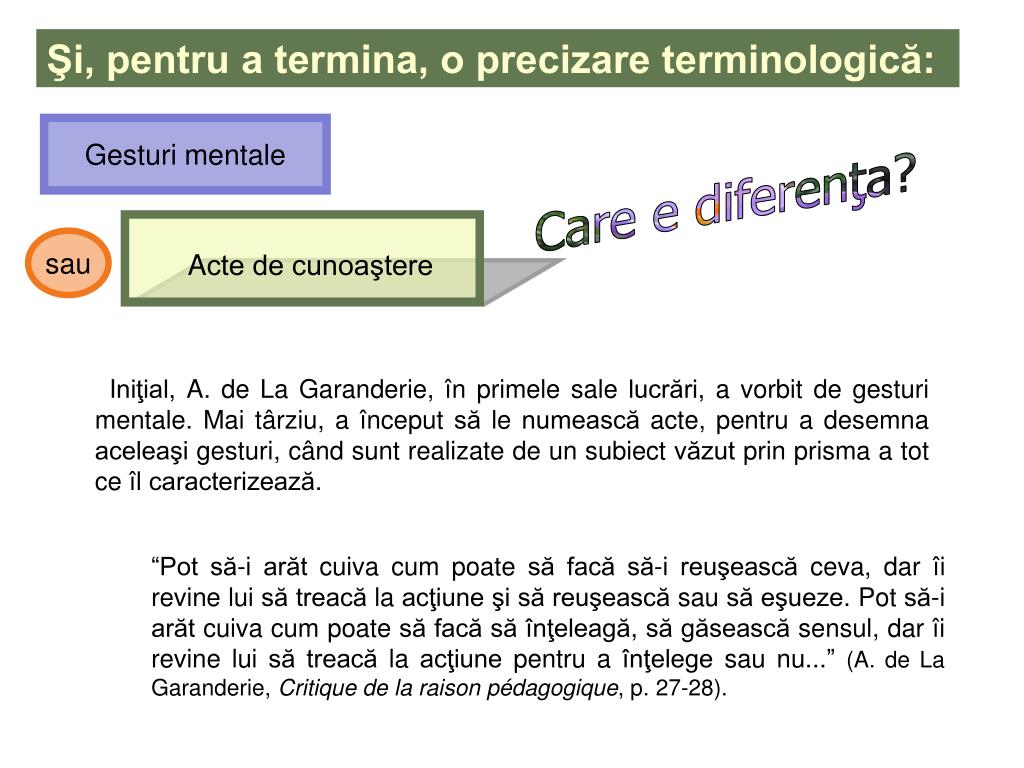 Şi, pentru a termina, o precizare terminologică: Gesturi mentale Care e diferenţa? Acte de cunoaştere sau Iniţial, A. de La Garanderie, în primele sale lucrări, a vorbit de gesturi mentale. Mai târziu, a început să le numească acte, pentru a desemna aceleaşi gesturi, când sunt realizate de un subiect văzut prin prisma a tot ce îl caracterizează. “Pot să-i arăt cuiva cum poate să facă să-i reuşească ceva, dar îi revine lui să treacă la acţiune şi să reuşească sau să eşueze. Pot să-i arăt cuiva cum poate să facă să înţeleagă, să găsească sensul, dar îi revine lui să treacă la acţiune pentru a înţelege sau nu...”(A. de La Garanderie, Critique de la raison pédagogique, p. 27-28).
