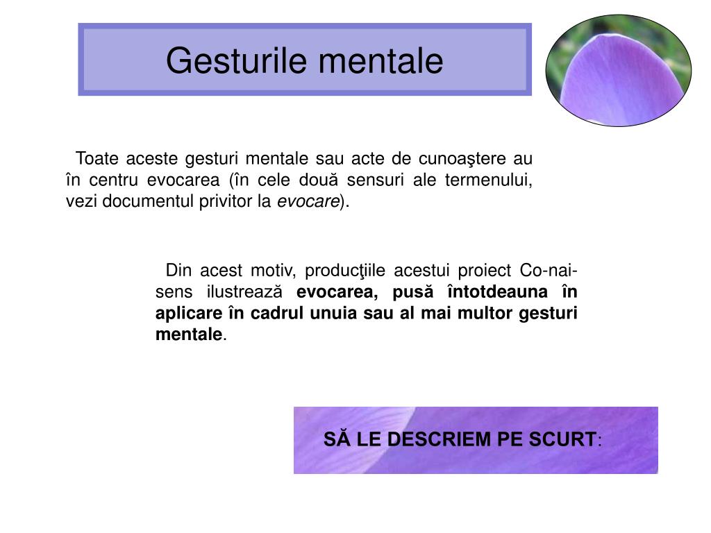 Gesturile mentale Toate aceste gesturi mentale sau acte de cunoaştereau în centru evocarea (în cele două sensuri ale termenului, vezi documentul privitor laevocare). Din acest motiv, producţiile acestui proiect Co-nai-sens ilustrează evocarea, pusă întotdeauna în aplicare în cadrul unuia sau al mai multor gesturi mentale. SĂ LE DESCRIEM PE SCURT: