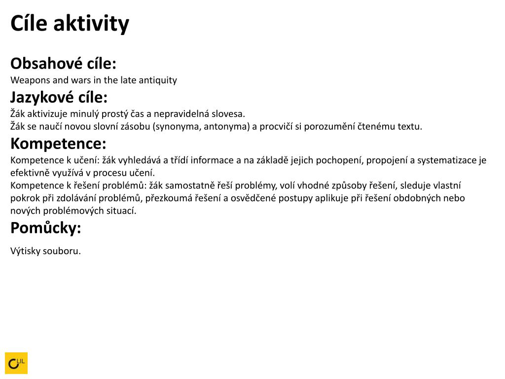 Cíle aktivityObsahové cíle: Weapons and wars in the late antiquityJazykové cíle: Žák aktivizuje minulý prostý čas a nepravidelná slovesa. Žák se naučí novou slovní zásobu (synonyma, antonyma) a procvičí si porozumění čtenému textu.Kompetence: Kompetence k učení: žák vyhledává a třídí informace a na základě jejich pochopení, propojení a systematizace je efektivně využívá v procesu učení. Kompetence k řešení problémů: žák samostatně řeší problémy, volí vhodné způsoby řešení, sleduje vlastní pokrok při zdolávání problémů, přezkoumá řešení a osvědčené postupy aplikuje při řešení obdobných nebo nových problémových situací.Pomůcky: Výtisky souboru.