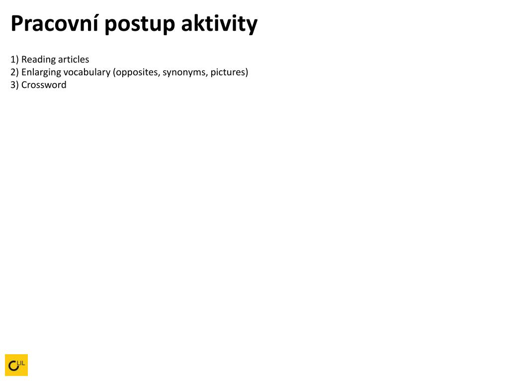 Pracovní postup aktivity1) Reading articles 2) Enlarging vocabulary (opposites, synonyms, pictures) 3) Crossword